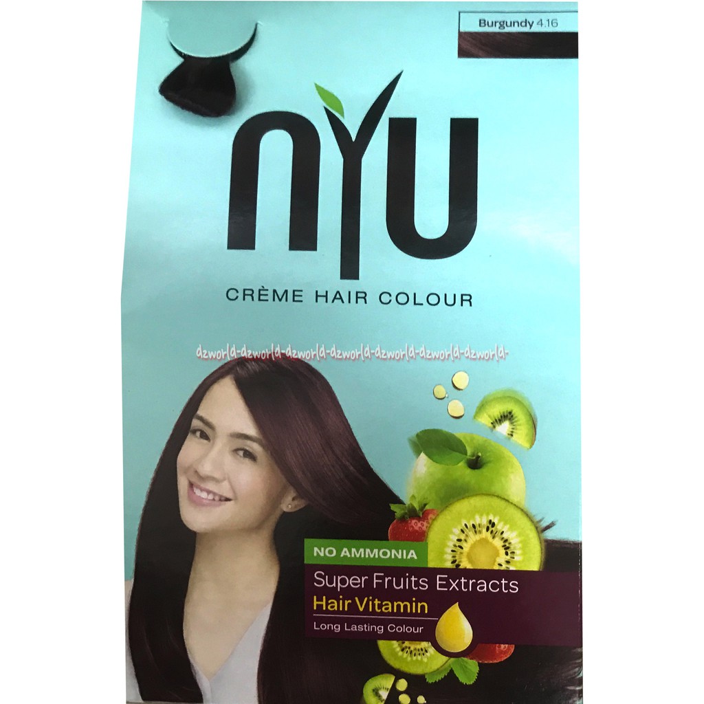 Cat rambut merk Nyu ini bebas ammonia dan diperkaya oleh super fruit extract yang berfungsi untuk melindungi rambut dari masalah iritasi kulit kepala akibat proses pewarnaan rambut Merk ini berasal dari India tepatnya diproduksi di Godrej Consumer Products Ltd 52 BIP yang di impor ke Indonesia oleh PT Megasari Makmur dan juga sudah memiliki